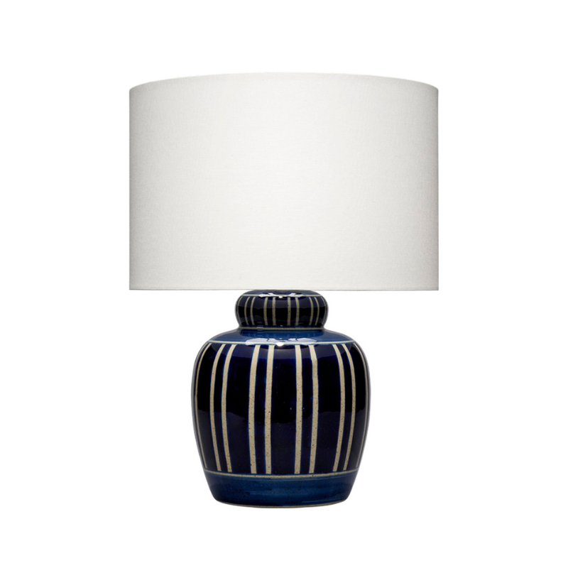 Welcome guests to your home with the soft, graceful curves of the Nautilus Table Lamp. This lamp beautifully handcrafted of fine, navy-blue ceramic and finished with vertical accents in natural that draw the eye up to a drum shade in cream linen. Soft, adjustable pools of light are created with the flick of a three-way switch. Casual yet refined, this striking lamp will add a nautical node to any space.