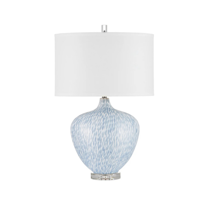 The Tinney Table Lamp features a weathered blue-and-ivory glaze reminiscent of sun-faded pottery found along the coast. Its gently rounded silhouette rests on a clear optic crystal base, balancing rustic patina with a touch of polish. Finished with a crisp white linen drum shade, it’s an easy way to bring layered texture and soft, ambient light into any room.