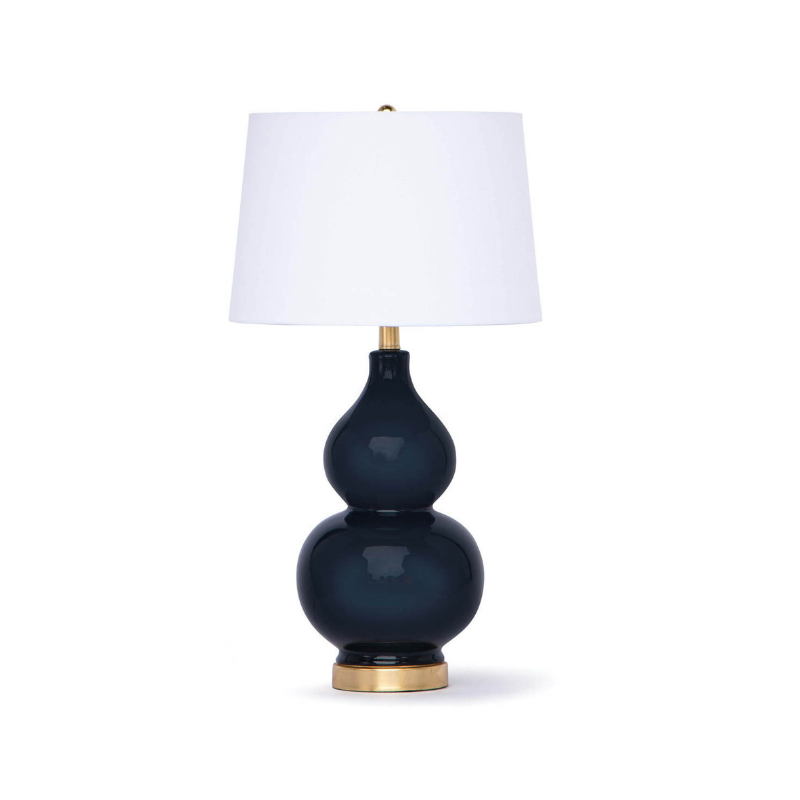 Elegant and eye-catching, the Ionian Lamp in navy glazed porcelain brings depth and sophistication to any space. Its gently rounded silhouette pairs beautifully with a hand-leafed gold base and matching finial, adding a subtle touch of glamour. Whether styled in a traditional living room or a modern coastal bedroom, this lamp makes a refined and radiant statement. This lamp is topped with a crisp white laminated linen shade.