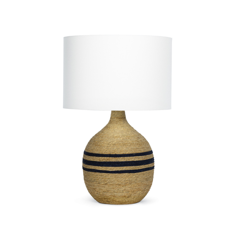The Maren Table Lamp embodies coastal chic with its elegantly natural rope-wrapped base, highlighted by three striking navy blue stripes that infuse a nautical flair. This versatile and stylish piece seamlessly enhances any room, offering a sophisticated touch of seaside charm. Elevate your decor with the Maren Table Lamp, a timeless addition that brings the serene beauty of the coast right into your home.