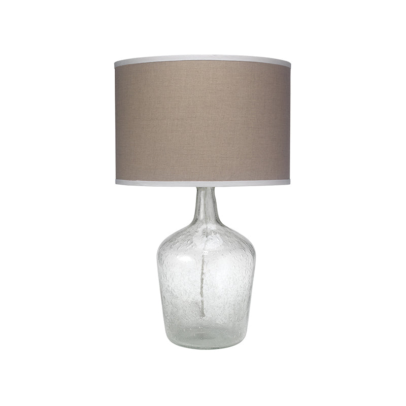 Our Sea Bright Table Lamp is the perfect coastal casual accessory! Its plum jar shaped seeded glass base is finely paired with a drum shade of natural linen with white linen trimming. Seeded glass is a hand blown rough glass where the texture of the glass is the most important design element. These rough and bubbled characteristics shine and glisten when the light hits the surface.