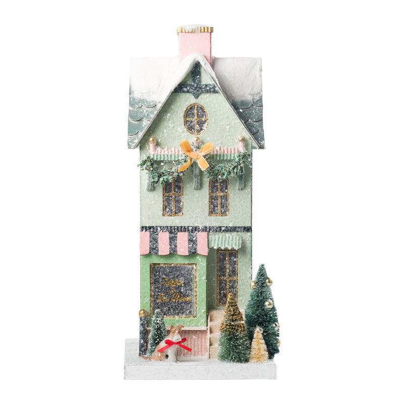 Step inside the charm of the season with our Tinsel & Tea Room. Handcrafted and full of nostalgic detail, this pastel-hued house brings a whimsical touch to your holiday décor. Whether displayed on its own or as part of a holiday village, its snowy roofline, festive wreaths, and bottle brush trees create an enchanting scene that feels straight out of a storybook.