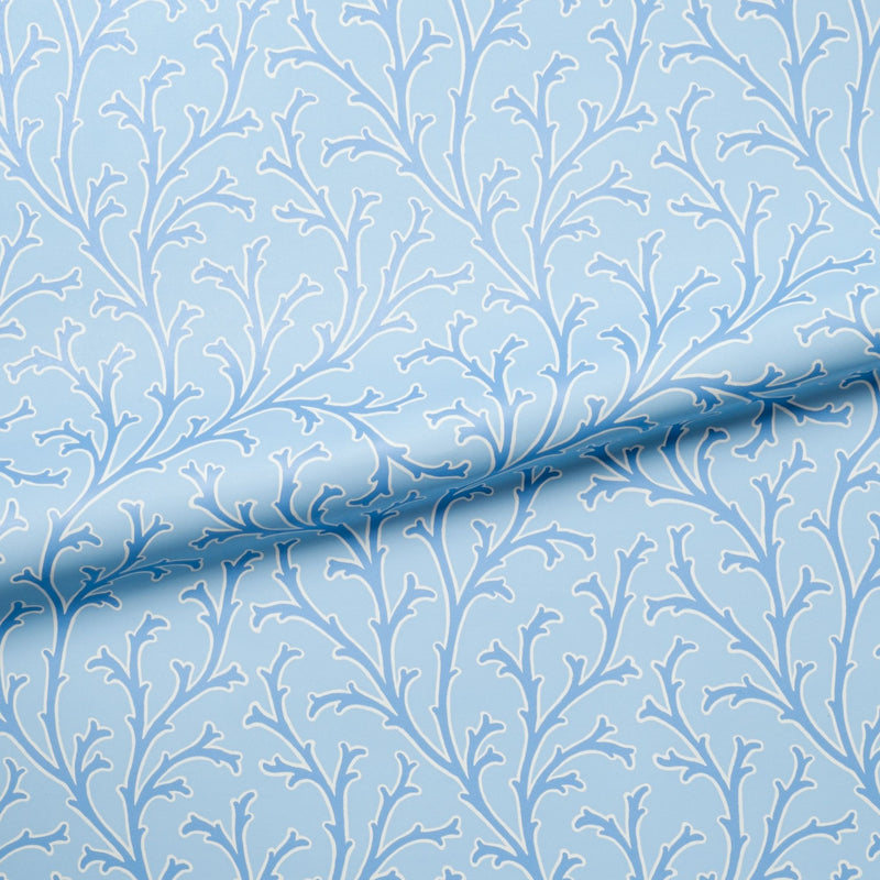 Our Corsica Blue Wallpaper captures the essence of coastal elegance with timeless appeal. The pattern features a coral-inspired motif, beautifully reimagined in a harmonious blend of beautiful blues. This design adds both movement and depth to any space, with its refined yet organic feel.  Its versatility makes it perfect for creating a serene bedroom retreat, a sophisticated bathroom, or a striking feature wall in a coastal-inspired home.  This wallpaper seamlessly merges traditional and coastal styles.