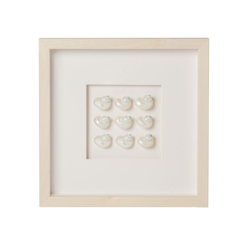 Capture the beauty of the sea with our Mini Pearl Turbo Shell Framed Art. Featuring nine small natural pearl abalone shells mounted on white board and framed in a custom maple wood frame, this beautiful piece will add a touch of the coast wherever it's place.