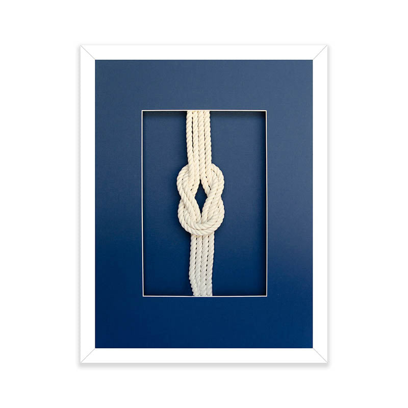 From the double square to the double figure eight, these hand-tied sailing knots are a showstopper. Each piece is made from natural rope and tied with perfect form. These unique knots come mounted on a rich navy mat board and can be styled alone or as a pair or trio for a collected look.