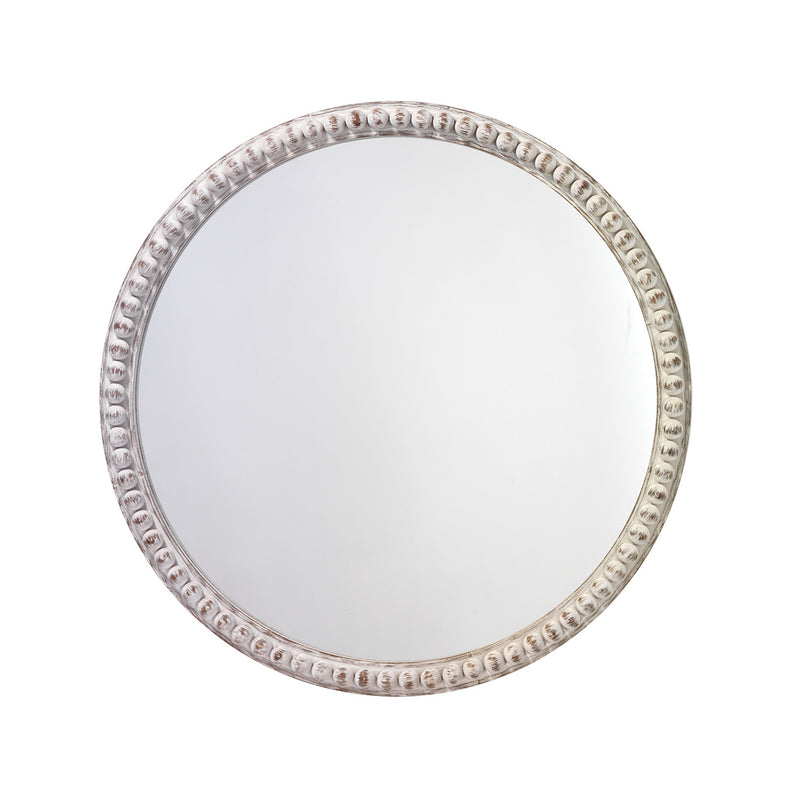 Our Capri Mirror is classically simple with its delicate, round frame in a white washed wood finish. The slender frame has the additional detail of wood spheres around its perimeter. This light and airy mirror is the perfect addition to any bedroom or bathroom.