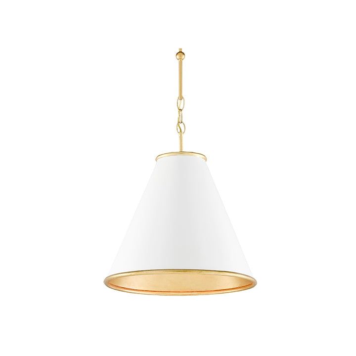 Our Pierrepont White Pendant is made of wrought iron with a gesso white finish on its exterior and a contemporary gold leaf finish on the interiors of the shades. Available in a small and large size. The rings connecting them gleam in a painted gold finish.